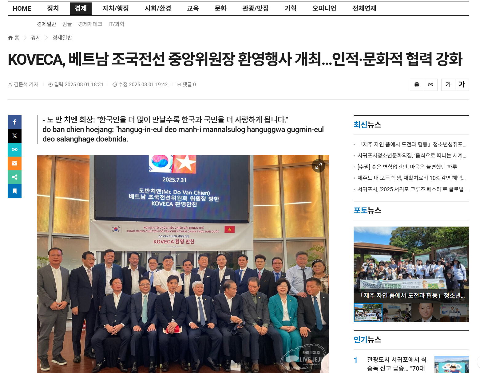 도 반 찌엔 위원장은 베트남 정치 서열 5위에 해당하는 고위 인사로, 이번 방문은 한국국제교류재단(KF) 초청으로 이루어졌습니다.