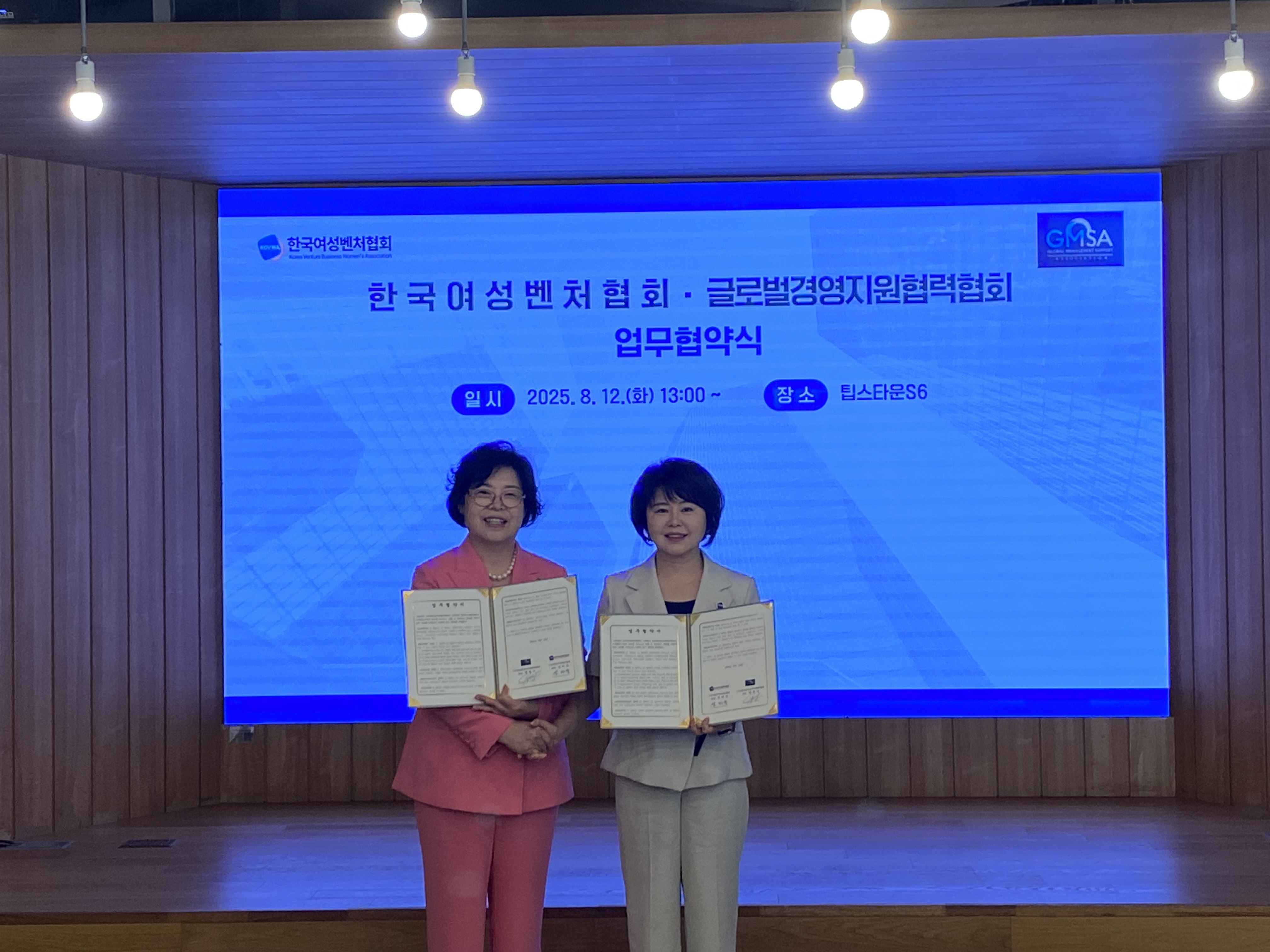 2025년 8월 12일, **한국여성벤처협회(회장 성미숙)**와 **글로벌경영지원협력협회(회장 장정미)**는